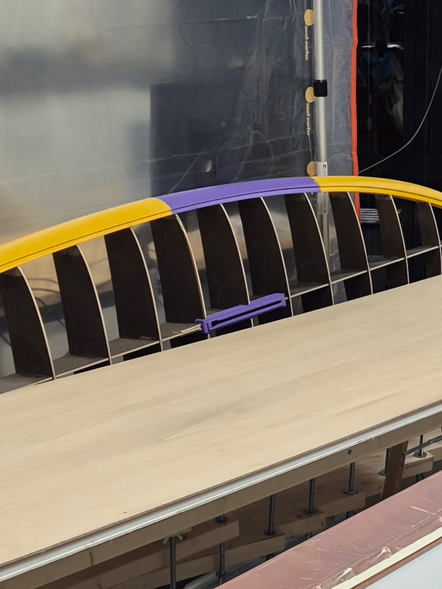 The fish-core and rails are glued together delivering a basis for an ultra light stiff and strong windsurf board.