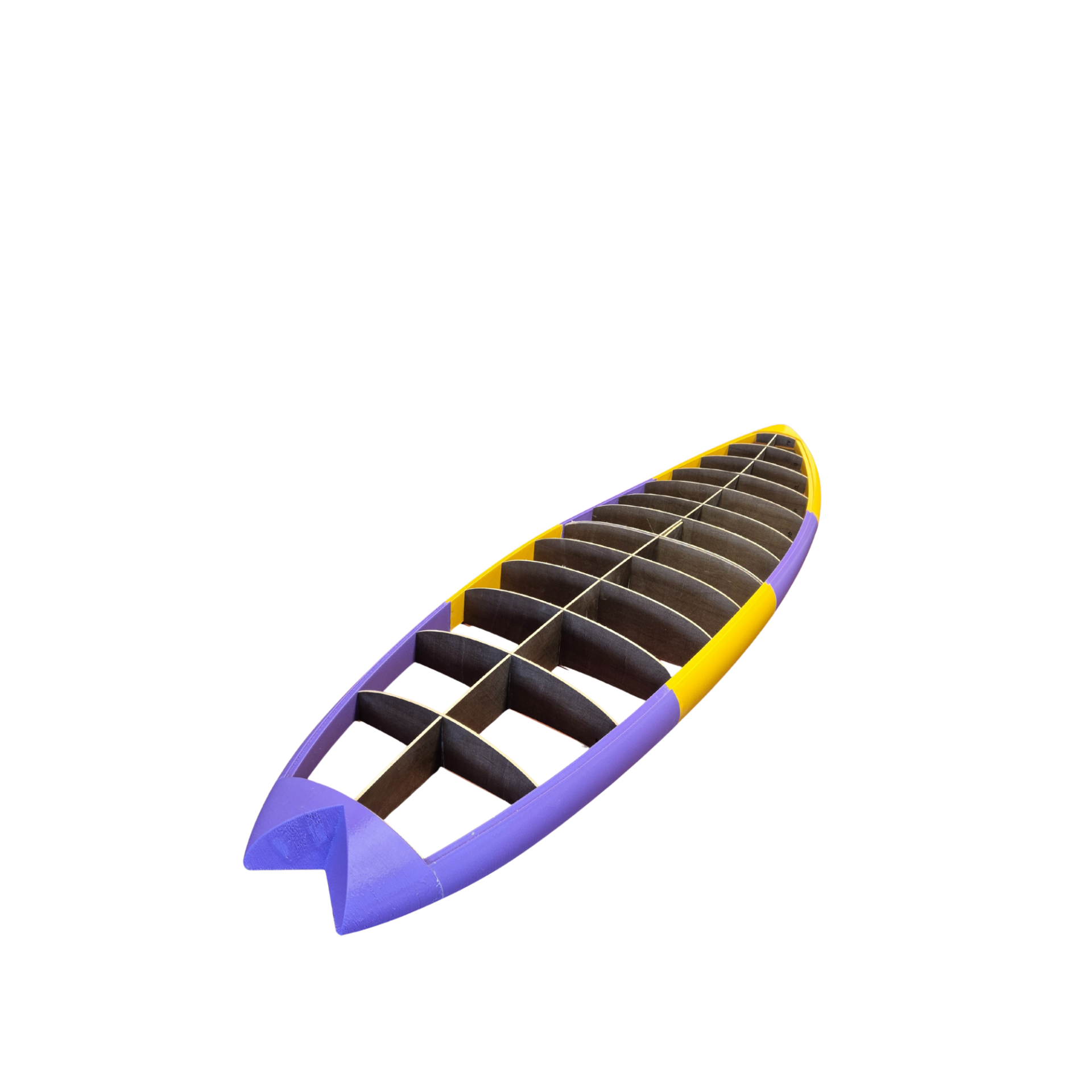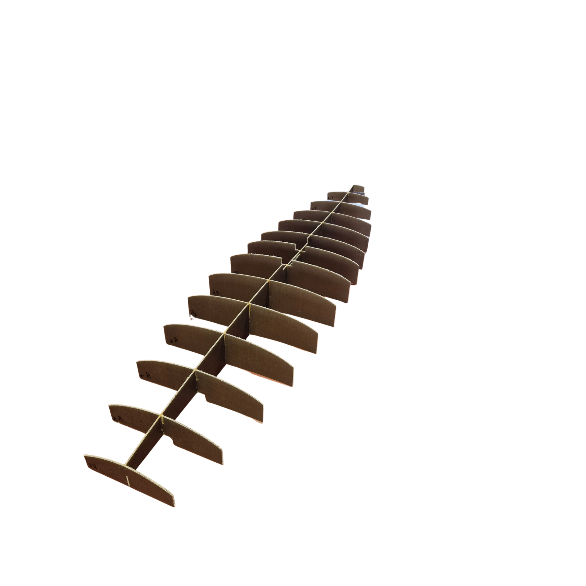 The core is cut into one stringer and thirteen ribs, creating the so‑called fish core. This fish core is then machined from a paulownia plate laminated on both sides with bio‑epoxy and basalt.